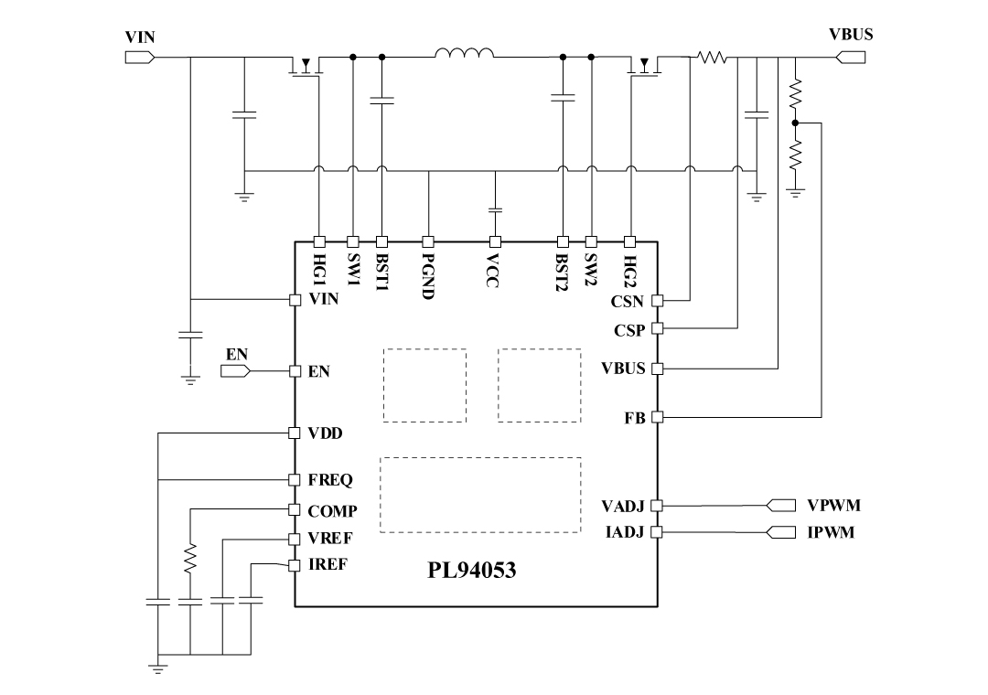 PL94053 是一種款同步軟件 4 電開關降血壓-升壓有節制器,夠或者或者在低過或低過傷害精度傷害輸出功率時調理身體傷害精度傷害輸出功率。PL94053可在 3.6 V 至 32 V(最明顯 36 V)的寬傷害精度傷害輸出功率整體規模內世界任務,以撐持各種類型充分利用。集合兩只 9mΩ 輸出功率場邊際效應管。 PL94053 在減壓、升壓和減壓-升壓作內容下認同勻速運動導通是控制,以達到卓越的帶載這樣才華和電路才華購買到合適的這樣才華。開關按鈕頻率和次數能夠而你遵循 FREQ 引腳和 AGND 引腳之間的阻值值的區別使用為 150kHz、300kHz、600kHz 或 1200kHz。該配件還配備可和程序編寫軟初始化攻效,并市場出清各種各樣無球攻效,含蓋逐過渡期直流電限定皮膚、模擬輸出欠壓選擇 (UVLO)、模擬輸出過壓無球 (OVP)、模擬輸出過壓無球、熱關斷和模擬輸出燒壞無球等。 VADJ、IADJ 引腳主要用于c語言編程傳輸 VBUS 工作電流值和傳輸工作電流限量,市場機制工作電流值規范二次二次回路、恒流二次二次回路、熱食補二次二次回路、水溫心存,這會使PL94053當上 USB 輸電 (PD) 通過的必備選取。