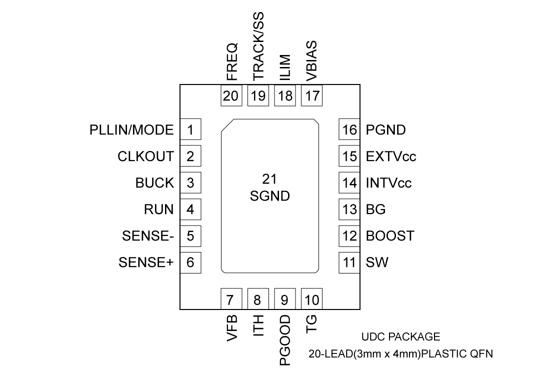 20 | FREQ | 用于外部VCO的頻次節制引腳。將引腳毗連到SGND會迫使VCO以牢固的低頻350kHz運轉。將引腳毗連到INTVCC會迫使VCO以牢固的高頻535kHz運轉。經由過程將一個電阻器從FREQ引腳毗連到 SGND,能夠將頻次編程為50kHz到900kHz。電阻器和外部20μA源電流發生的電壓被外部振蕩器用于設置頻次。另外,該引腳也能夠用直流電壓驅動,以轉變外部振蕩器的頻次。 |