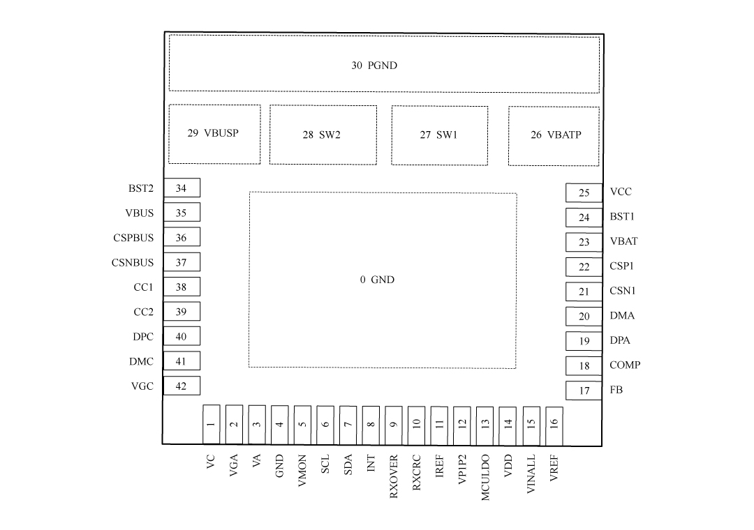 35 | VBUS | 輸入電壓或輸入電壓點,接1uF陶瓷電容到PGND,盡能夠接近引腳 |