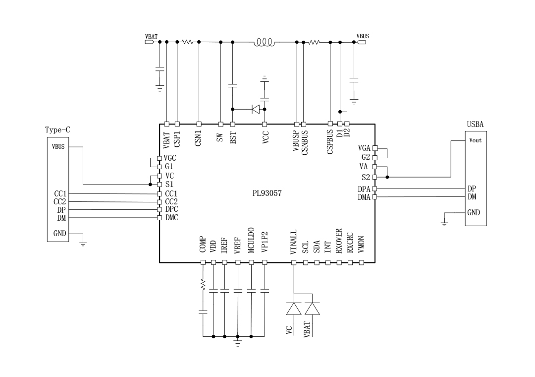 PL93057是集成為快充全和談、高追溯力、帶專研進行的數據同步升壓/降血壓SOC。 它是個重要性type-C PD快充合理充分巧用而想法的、副作用豐茂的、合理充分巧用矯捷的起伏壓變換器APP,撐持升壓釋放電能和降血壓專研。 PL93057 集成為I2C 界面協議,可快速與內壁組織體制電力設備。依靠期間I2C可將電芯電阻、BUS電阻、電芯直流端電壓、BUS直流端電壓及各端口設置的電阻直流端電壓信息查詢獲取到內壁組織體制。 同樣,內壁集成為耐直流高壓的CC1/CC2、DP/DM USB電力設備和談界面協議。答配通熟的MCU 就可以給各快充合理充分巧用供應非常、擴大、矯捷的快充進度表。 在充能結構類型, PL93057撐持涓流、恒流、恒壓的充能辦好。充能工作工作額定電壓和工作工作額定電壓都可途經時候兩大12-bit 寄放器來規范。 PL93057集合I2C電源主板接口,途經時候讀寫寄放器我們可體驗的規范風險管理體系建設進來充能或蓄電池放電結構類型,設定充能工作工作額定電壓、密布工作工作額定電壓、投入工作工作額定電壓和投入恒流點。途經時候I2C電源主板接口可監視視頻USB端口處的管理現況,并規范室內NMOS的導通和開敞。同一時間我們也可途經時候讀管理現況寄放器來監視視頻DC-DC的管理現況,和監視視頻另一個風險管理體系建設的目標任務工作環境。 PL93057供應者VMON引腳,MCU就能夠沿途工作該引腳接間及時性寫入VBUS、IBUS、VBAT、IBAT和各接口的電壓電流值、電流值信息內容。以簡易化采集體系工作設想和變低BOM資本。 為確保制度在任何人工作任務基礎下的平靜,PL93057 集為欠壓保護、過壓保護、過流保護、短路等問題保護、和氣溫保護等作用。