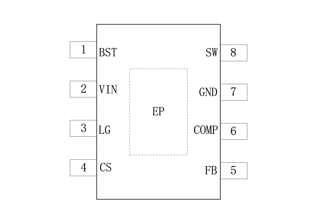 4 | CS | 電流檢測輸入。在此引腳和 GND 之間毗連一個 10mΩ 至 100mΩ 的電阻器,以設置電流限定。 |