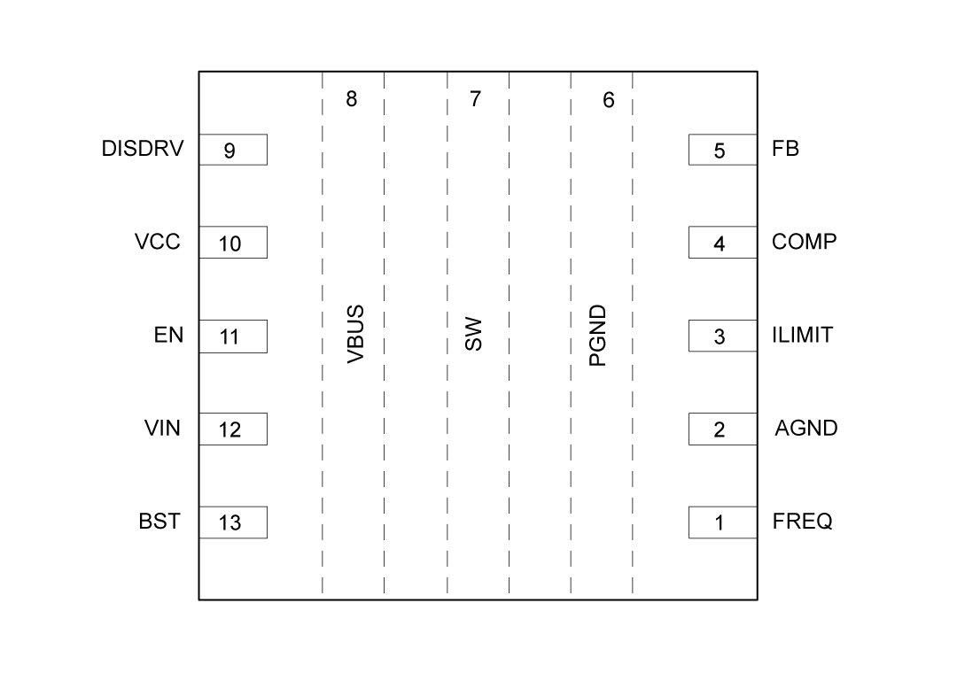 8 | VBUS | 升壓轉換器的輸出引腳,該引腳在外部毗連至高側場效應晶體管(HSFET)的漏極 |
